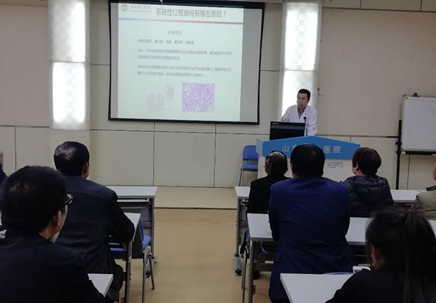4月22日,杨清锐书记带领内科党总支第七党支部志愿者团队,在医院北区多媒体教室举行了“系统性红斑狼疮的健康管理”知识讲座,为此类病患及家属带来一场“及时雨”。