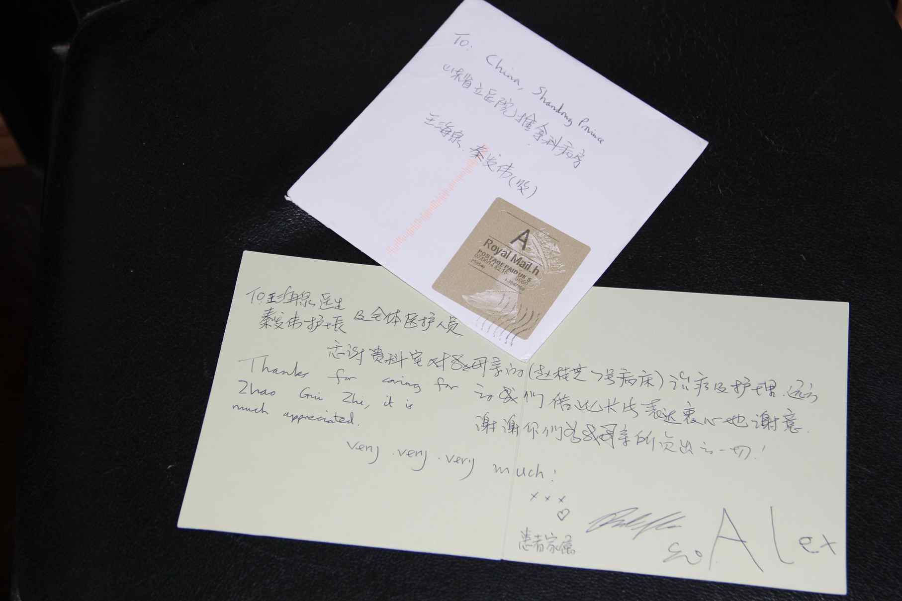 是我们精湛的医术和无微不至的护理,感动了老人和在大洋彼岸的女儿和她的家人,老人的康复也是我们辛苦工作的肯定,这封来自异国的贺卡也给我们努力工作的精神食粮。