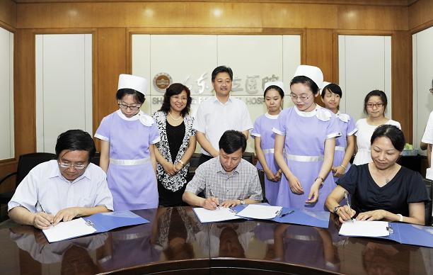 山东省立医院总会计师姜民杰与山东大学哲学与社会发展学院社工系主任高鉴国、山东财经大学法学院院长宋焱共同签署“共建社会实践基地协议书”。