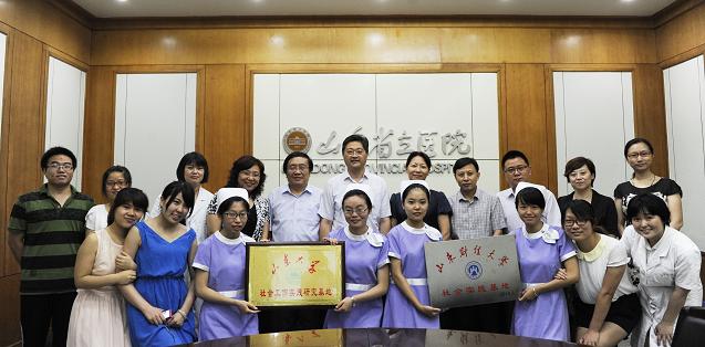 2014年7月17日上午,山东省立医院与山东大学、山东财经大学共建社会实践基地签约及揭牌仪式在省立医院仁和楼第一会议室举行,仪式由省立医院医务社会工作办公室主任尉真主持,山东省立医院院长、党委书记秦成勇,山东省立医院总会计师姜民杰、山东大学哲学与社会发展学院社工系主任、教授高鉴国,山东财经大学法学院院长、教授、山东省政协常委宋焱,山东财经大学法学院党总支书记、教授邵文涛,山东财经大学社会工作教研室主任、副教授陈爽及山东财经大学社会工作专业2011级社会工作班学生代表参加了签约揭牌仪式。