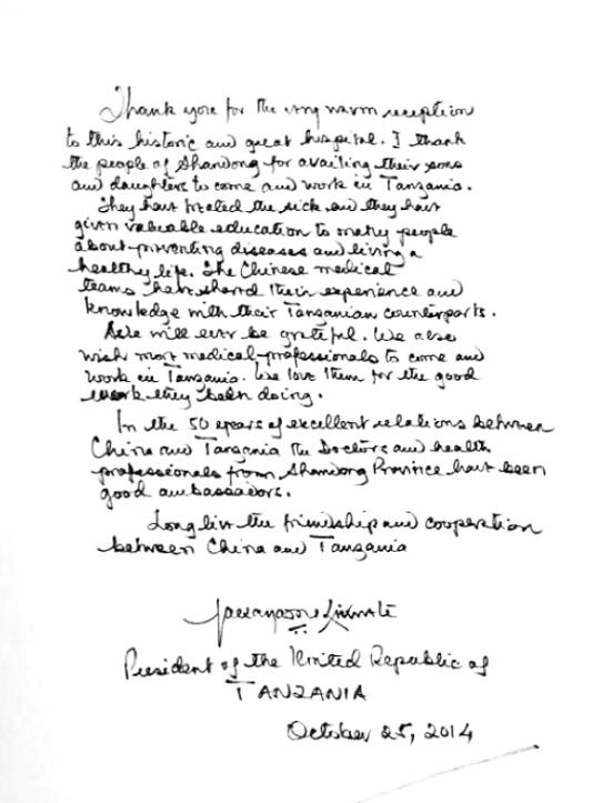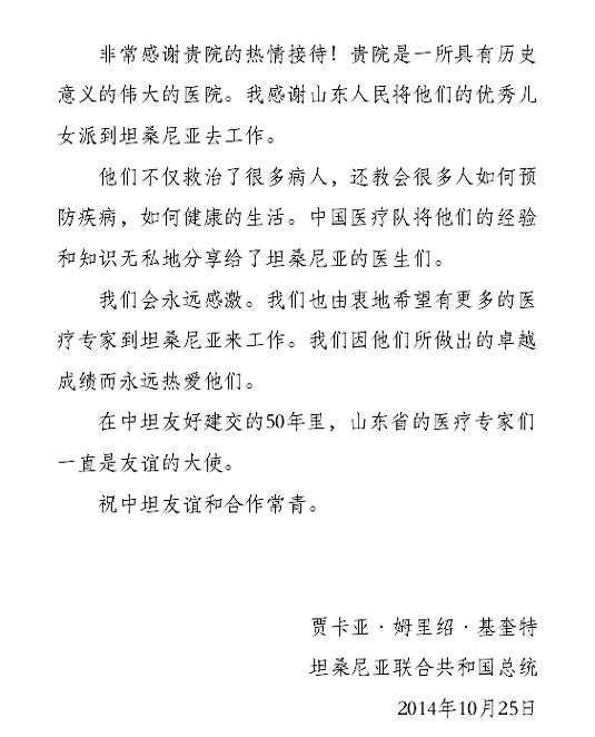 基奎特总统高度赞誉了山东省赴坦桑尼亚医疗队的工作,代表360万接受过医疗队帮助的当地居民表示感谢。他说,今年是中坦建交50周年,50年来坦桑尼亚在医疗水平和医疗设备方面都有了长足发展,他非常希望有更多的医疗护理人员能去坦桑尼亚,并表示会将大家的祝愿传达给坦桑尼亚国内的人民。