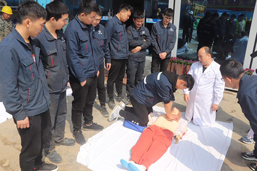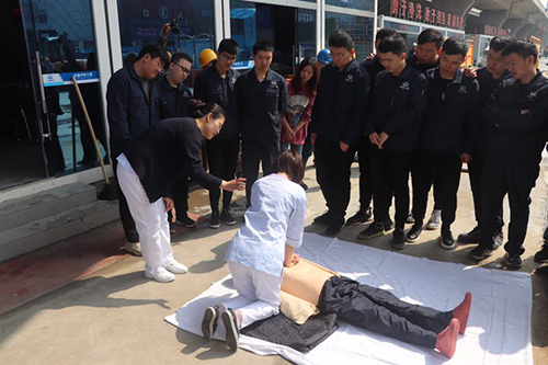 医师张琳为大家阐述了心肺复苏的概念,及时实施心肺复苏的必要性和重要性,并详细讲解了心肺复苏实施过程中的技术要领及注意事项。授课结束后,张斯斯等医护人员又为工人们进行了心肺复苏操作示范,现场演示实施胸外按压时的位置及频率、人工呼吸技巧及方法等,工人们亲身体验了实际操作,对心肺复苏有了进一步的直观感受。