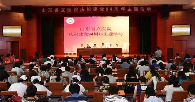 2015年7月2日下午,山东省立医院在东院区诚和楼四楼礼堂举办庆祝建党九十四周年主题活动。院领导、职能部门正副职、各党总支书记、总支委员、支部书记、支部委员、各业务科室党员主任、护士长及党员代表、民主党派代表参加了大会。会议由医院党委委员、副院长管善卫主持。