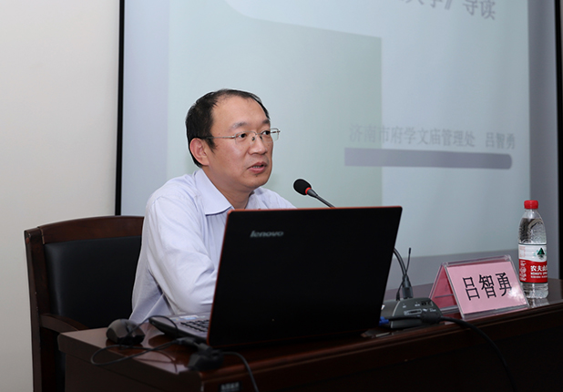 吕主任现任济南市府学文庙管理处主任,中国哲学史学会曾子研究会理事,山东大学、济南大学等多所院校客座教授,济南市社会主义核心价值观宣讲专家,山东省和济南市“尼山书院”专家库专家。多年来研习儒家经典,致力于传播中国优秀传统文化,是文庙公益讲堂发起人之一,多年来开展公益讲座三百多场次。主讲题目有:《儒家文化中的“修齐治平”思想》、《中华优秀传统文化之儒学经典导读》、《中华优秀传统文化与社会主义核心价值观》、《传统文化中的廉政智慧》、《传统文化中的礼法合治》、《中华文化讲求个人诚信》、《中华好家风》等。