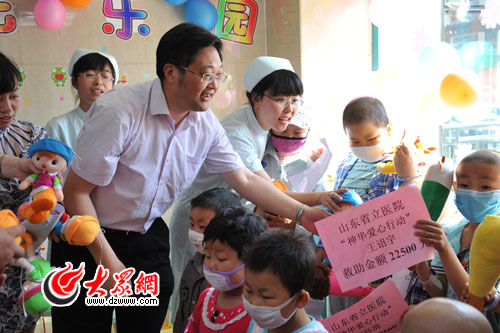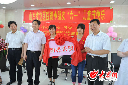 5月30日下午,一个专门为“白血病”患儿开设的“阳光乐园”在山东省儿童医院住院部开园。今后,一批经过专业培训的“社会工作者”将长期入园,运用专业理念、方法和技巧,通过“欢乐总动员”、“亲子1+1”等游戏互动活动丰富患儿单调的住院生活,为患儿及家长进行心理疏导和支持,鼓励他们以积极乐观的心态战胜病魔。