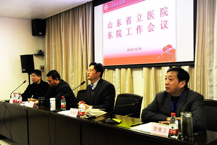 2012年12月14日,值东院开业两周年之际,山东省立医院东院工作会议在B楼三层中厅隆重举行。医院院长、党委书记秦成勇,医院领导邵延彪、管善卫、王玉林,医院部分职能部门和东院职能部门负责人、东院业务科室的科主任、护士长参加会议。