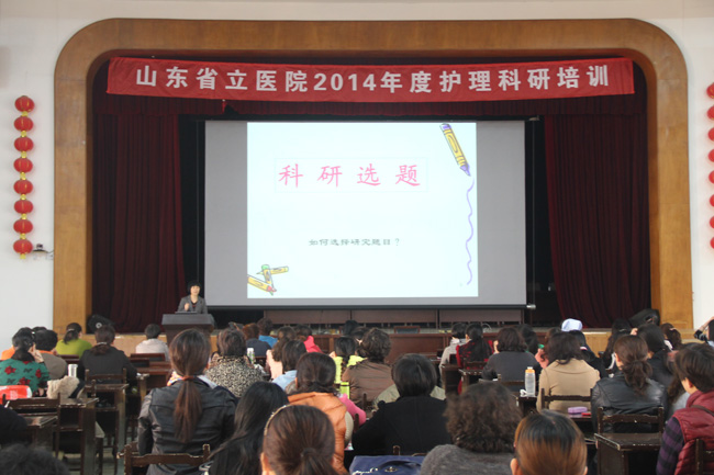 为全面提升临床护理人员科研水平及创新能力,提升护理管理及专科护理水平,推动护理专业发展,护理部计划于2014年开展护理科研系列培训,并于3月23日上午启动了第一期培训项目,特邀山东大学护理学院曹枫林副院长就《护理科研选题及研究设计》进行了专题讲座,全院护士长及骨干护士近300人参加了培训。