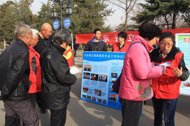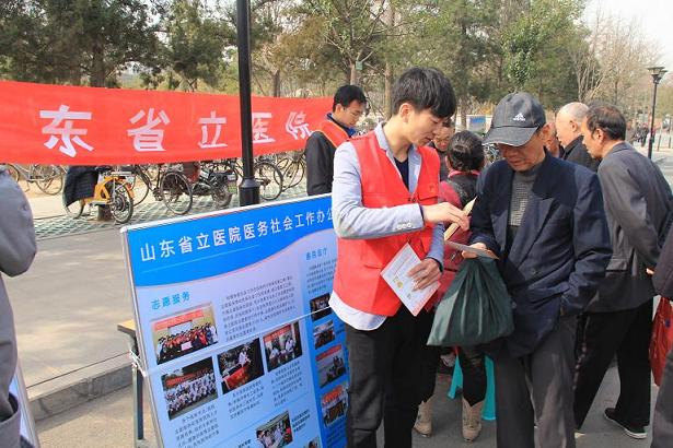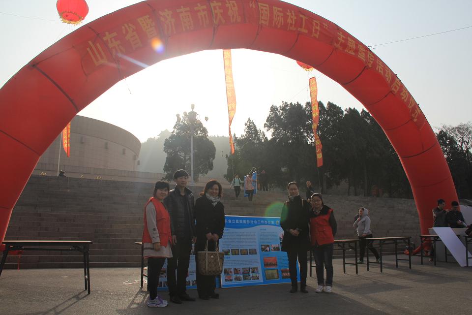3月18日,济南市庆祝国际社工日主题宣传活动启动仪式在济南战役纪念馆门前举行,来自泉城的38个单位和组织参与本次活动。山东省立医院医务社会工作办公室带领社工及志愿者也参与其中,帮助市民了解医院的公益服务项目与专业社工活动。