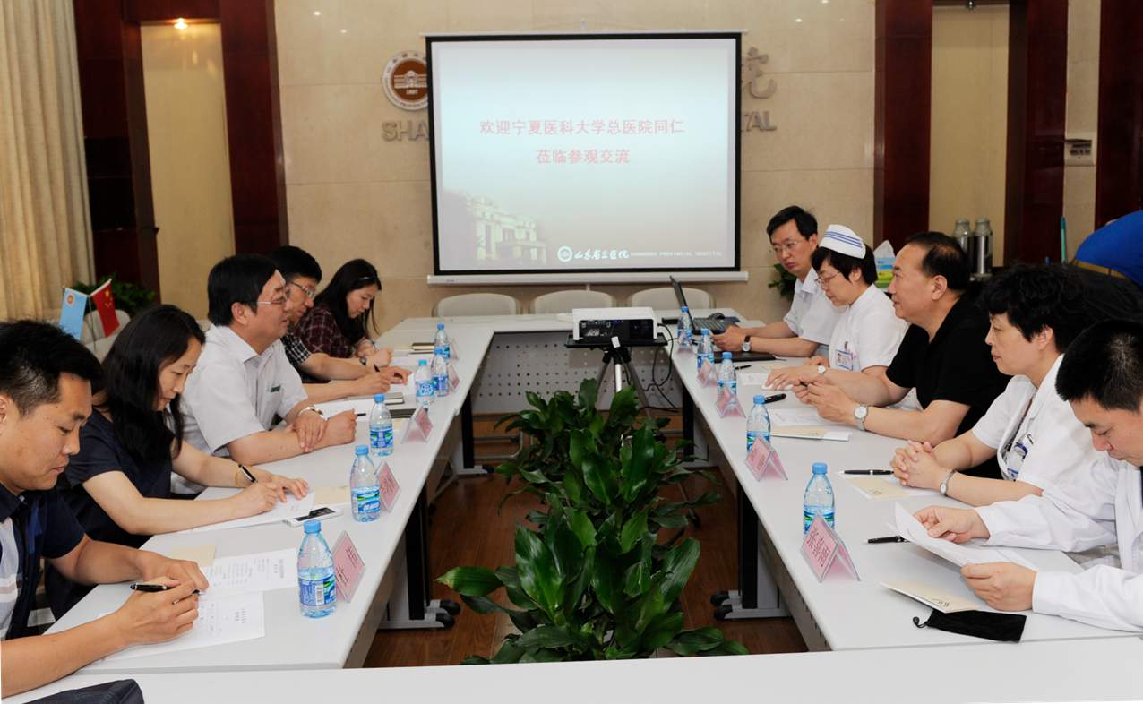 2014年6月19日,宁夏医科大学总医院贾绍斌副院长带队一行5人到我院考察交流。医院副院长董庆主持会议并介绍了医院情况。