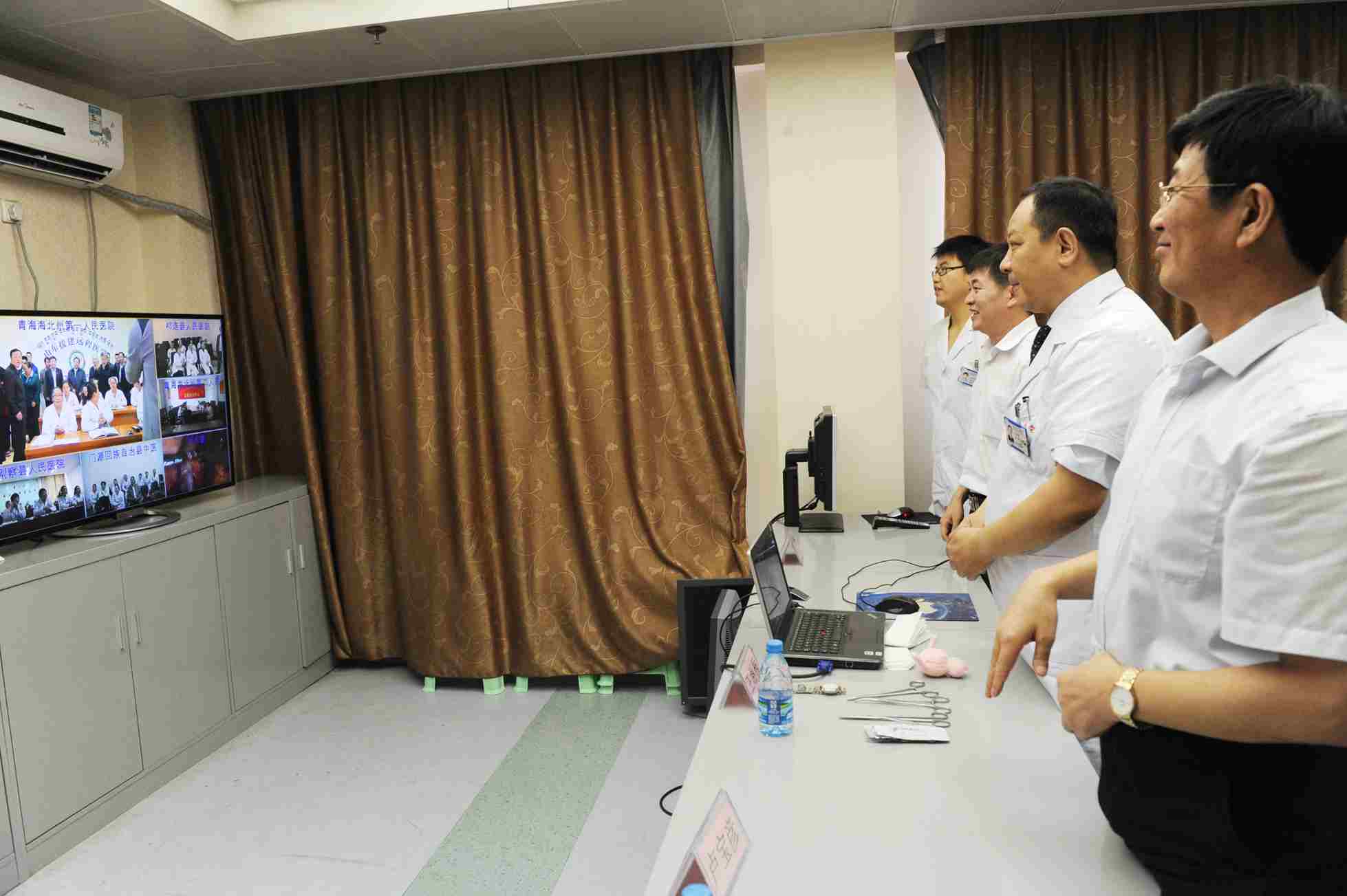 8月21日上午,山东省省长郭树清、山东省卫生和计划生育委员会主任刘奇及其他省厅有关负责同志视察我院援建的青海省海北州第一人民医院,并观看我院远程教育和远程手术直播。我院工会主席卢宝彦,医务部负责人曹铭锋,产科主任王谢桐在远程医学中心参加座谈。