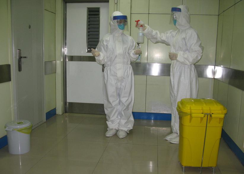 为了加强埃博拉热疫情的防控,提高相关临床科室应对疫情的快速反应和应急处理能力,此次演练模拟急救中心门诊接诊一名“疑似埃博拉出血热患者”后各相关科室联动的处理过程。下午3时,一名“疑似埃博拉出血热”患者来我院就诊。病人自述发热体温39度、无力等症状。一周前曾去几内亚出差,并与埃博拉病人有过接触。