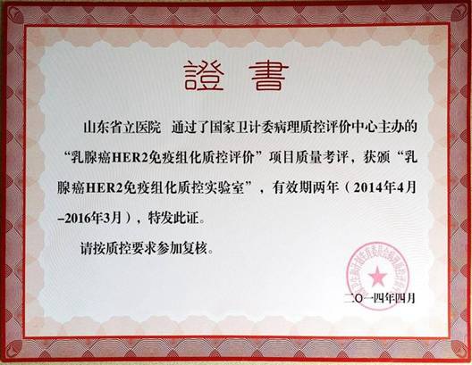 近日,我院病理科通过了国家卫计委病理质控评价中心(PQCC)主办的“乳腺癌HER-2免疫组化检测质控评价”项目质量考评,获颁“乳腺癌HER-2
