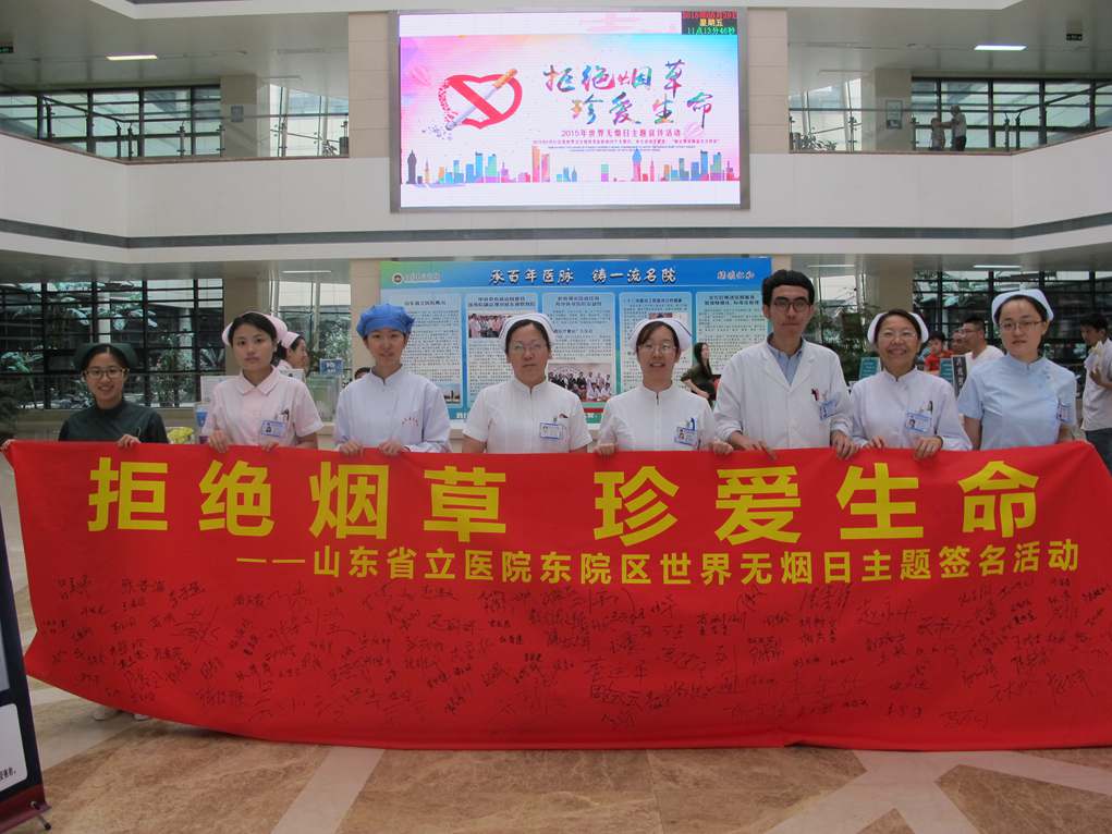 活动地点设在东院门诊大厅,参加此次义诊活动的有山东省立医院东院健康教育护理组成员、呼吸科医师及门诊工作人员。此次活动内容主要包括:通过门诊电子屏播放禁烟主题的宣传片;门诊大厅摆放吸烟危害等相关宣传展板;呼吸科医师进行吸烟危害与肺部健康知识普及;提供免费的基础查体项目;发放控烟禁烟相关内容的宣传单及“拒绝烟草 珍爱生命”主题签名活动。