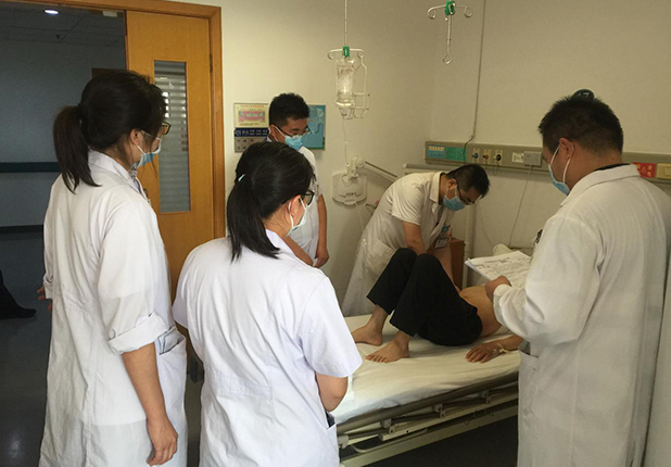 查房活动分三个阶段有条不紊地进行。规培学员做简要病历汇报及现场体格检查,然后带教老师问诊示范、现场演示规范查体。消化内科主治医师陈勇对专科查体部分做了规范示教,手把手地为学员展示规范的腹部查体。最后,由带教老师组织病例讨论。陈勇就患者的危险因素、病情进展、鉴别诊断、治疗方案的选择、影像资料学习、患者预后等多个方面做了精彩报告。全科医学科主治医师张永生从全科的角度出发,对社区管理、社区康复、危险因素控制、饮食、运动、心理治疗措施等方面进行了精彩的讲解。通过病例讨论,大家对上消化道出血的整体诊断、治疗有了更深入的认识。