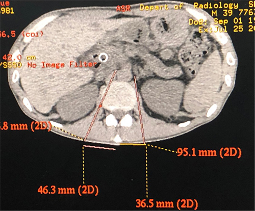 在医院影像科的配合下,疼痛科治疗团队通过CT设计穿刺进路,使得穿刺针到达了靶点位置。因患者曾经做过化疗和放疗,使得腹腔黏连加重,增加了手术难度,不利于毁损药物的扩散,但经过对穿刺针的反复调试,最终达到理想的效果。