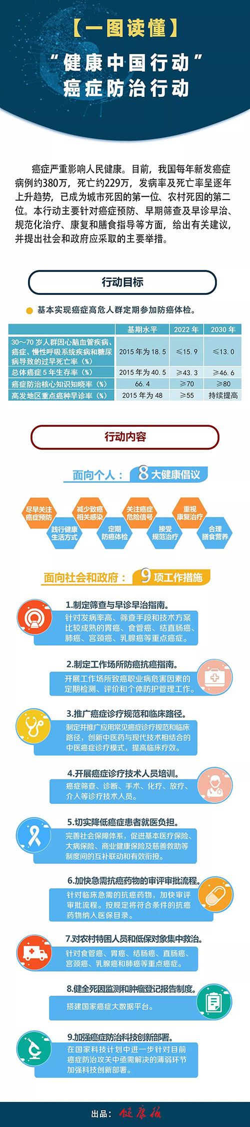 癌症严重危害群众健康。《2017年中国肿瘤登记年报》显示,我国每年新发癌症病例约380万,死亡人数约229万,发病率及死亡率呈现逐年上升趋势。随着我国人口老龄化和工业化、城镇化进程不断加快,加之慢性感染、不健康生活方式的广泛流行和环境污染、职业暴露等因素的逐渐累积,我国癌症防控形势仍将十分严峻。国际经验表明,采取积极预防、早期筛查、规范治疗等措施,对于降低癌症的发病率和死亡率具有显著效果。下面我们用一张图来看懂癌症防治行动的主要内容。
