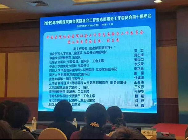 近日,“创新服务 促进健康 共享成果——2019年中国医院协会医院社会工作暨志愿服务工作委员会第十届年会”在上海召开。本次会议进行了换届选举工作,上海国际儿童医学中心季庆英书记担任中国医院协会医院社会工作暨志愿服务工作第二届委员会主任委员,委员会设副主任委员13人,山东省立医院党委委员、副院长、工会主席姜民杰参加会议并当选中国医院协会医院社会工作暨志愿服务工作第二届委员会副主任委员,对外合作与医务社会工作处副处长尉真当选常务委员兼副秘书长。