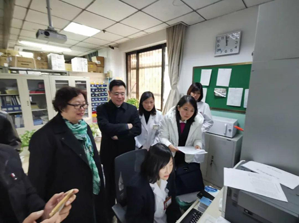 郭际水副局长一行随后来到中心院区门诊西药房实地调研,对国家组织药品集中采购中标药品在我院配备情况进行了详细深入的查看和了解。