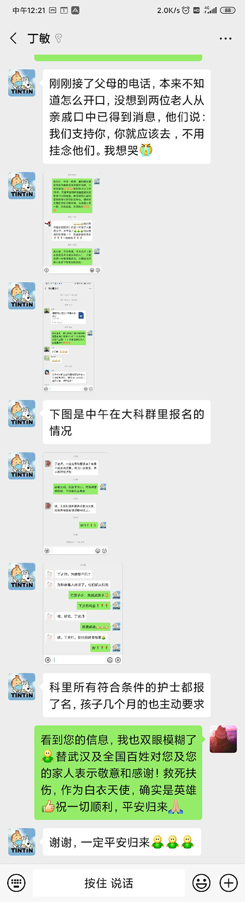 然而,当天中午12时许,记者收到了丁敏护士长发来的一条信息:“刚刚接了父母的电话,本来不知道怎么开口,没想到两位老人从亲戚口中已得到消息,他们说:我们支持你,你就应该去 ,不用挂念他们。我想哭……”