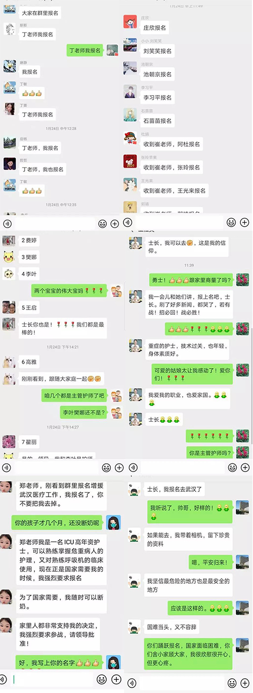 在医院组织科室发热门诊值班报名中,护理人员也主动放弃休假,还没回家的默默退掉车票,已经回家的立刻买好返程车票,群内整齐的回复着“我报名,随时待命!”……所有人的神经都被冠状病毒疫情紧紧地牵着。