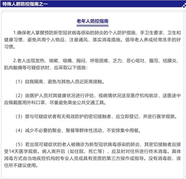 日前,国家卫健委发布新型冠状病毒防控指南(第一版),针对老年人、儿童、学生等特殊人群发布了相应的防控指南,针对幼儿园(或学校)、养老院、办公场所等特定场所也制定了相关指南,同时发布了相关的专家建议。