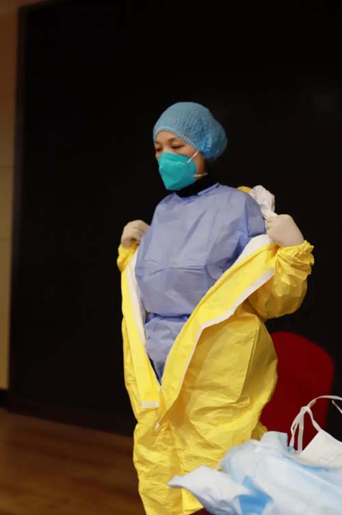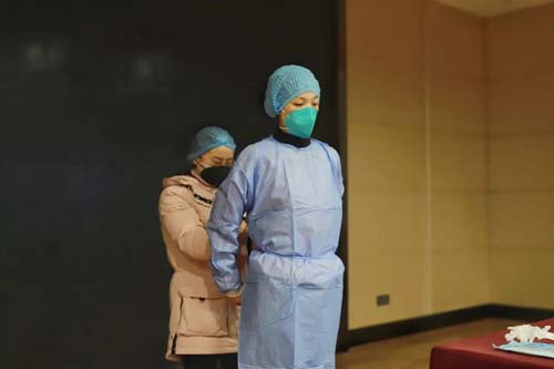 培训会上,专家进行了有关新型冠状病毒感染的肺炎疫情防控培训。现场逐步讲解演示穿脱防护服要领和注意事项,强化医疗队员们穿脱防护服练习,并解答医疗队员的问题。医疗队员进行医护合作练习,为进入一线“战疫”做好准备。同时,省医第三批援鄂医疗队员李健、李洪振、段飞、王艳艳递交了入党申请书。他们表示,在抗疫战场上,一批批医疗队党员战友们以身作则、勇于担当、冲锋在先的事迹,深深感染和激励了他们,向党组织递交申请书,请党组织在疫情战斗中考验我们。