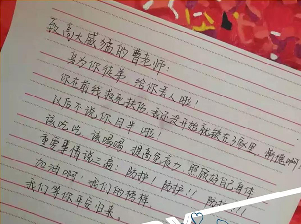“我们在科里工作,曹恒在前线奋战。我们也是时时的关注他们在前方的各种信息,也会随时给他加油鼓励!收到科室里伙伴们自发想到的这样加油的方式,让我发给曹恒的时候,我很震撼,也很感动!让我实实在在感受到了我们重症医学三科是一个有爱有力量的团队。”重症医学三科护士长韩瑜看着大家给曹恒用心书写的一张张鼓励卡片时,眼里湿润了,心里无比欣慰!