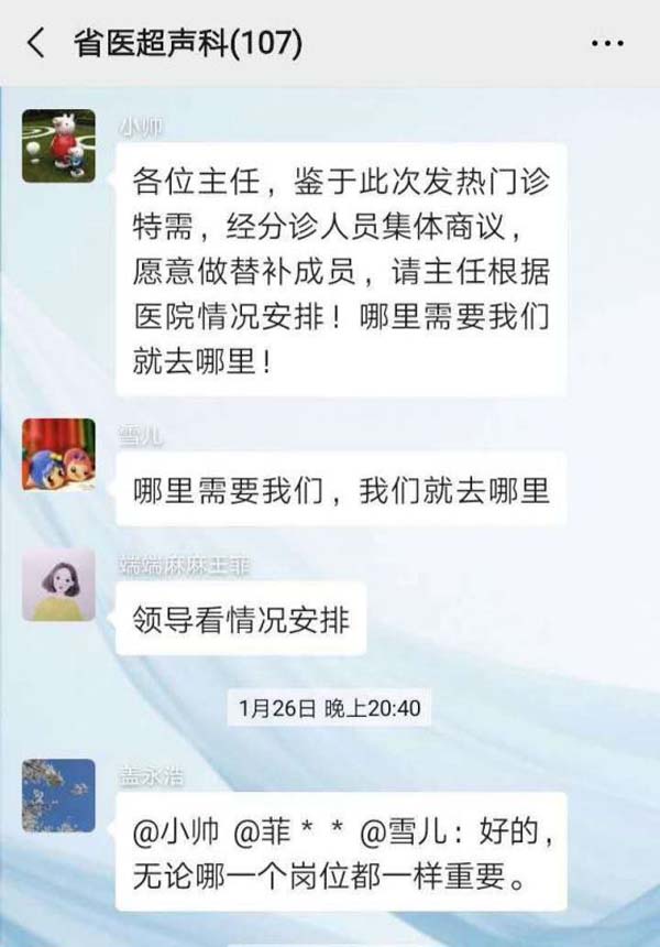 发热门诊是疫情防控的第一线。为了全面做好防控工作,医院选派医护人员参与春节期间发热门诊的值守。科室刚一下发通知,“我报名!”“我愿意!”“我带头!”……几分钟后回复齐刷刷发来,一声声铿锵有力的响亮回答,是职业精神的召唤,更是医者的本能。
