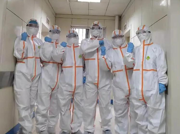 医院发热门诊值班的医护人员穿着防护服比出加油的手势