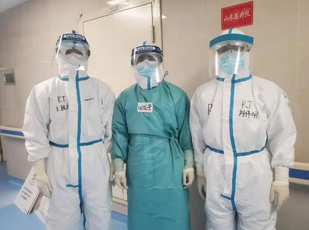 呼吸治疗师是一种新兴的医学职业,工作是在医生指导下,对心肺功能不全或异常者给予诊断、治疗和护理。如今,山东省共有近100名呼吸治疗师,分布在各个医院的重症医学科、呼吸科、急诊等一线科室。疫情发生后,呼吸治疗师们在不同的岗位发挥着重要的作用,第一批山东支援湖北医疗队中就有三位来自不同医院的呼吸治疗师奋战在一线:山东第一医科大学附属省立医院重症医学科的刘伟明、山东省济宁市第一人民医院重症医学科王祝国、山东省聊城市人民医院重症医学科田龙营。他们从第一天进重症病房工作到现在,已经在湖北黄冈大别山区域医疗中心奋战了40多天。