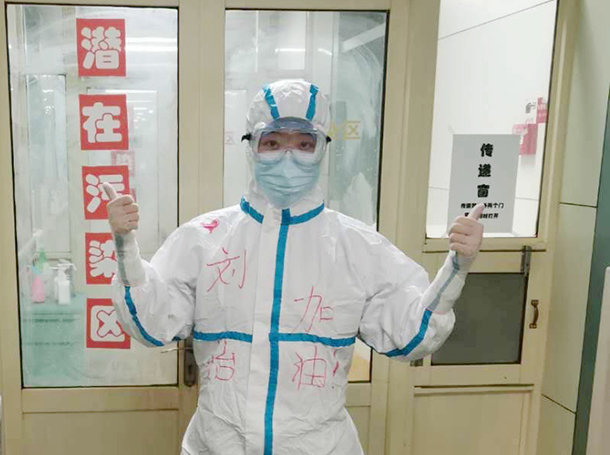 我们护理组7人要负责护理4名危重患者、2名重症患者。护理组里有一直奋战在一线的“老兵”,也有像我这样初来乍到的“新兵”。看着其他同事们从容而又严谨、迅速而又规范的操作,尤其是对我额外照顾和精心指导,先前的一丝紧张早已消散无踪。当我们穿上严密的防护服看不清近在咫尺的容颜,当我们彼此在防护服上写下名字和重重的加油字样,我由衷地对这些一直坚守在战“疫”前线的“老兵”感到敬佩,也为自己能够成为他们其中的一员感到自豪,我再次暗暗下定决心,担当有我,并将不负重托。