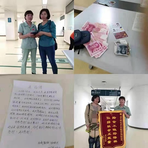 10月8日,省立医院东院影像科保洁领班张连翠在工作时捡到一个黑色手挎包,包内有现金9000余元、银行卡3张及身份证、医保卡。在影像科登记室工作人员的帮助下,张连翠通过医保卡信息查找到了失主的联系方式并与失主取得了联系。大约半小时后,失主孙女士赶来,孙女士说这是她父亲的救命钱,热泪盈眶的对张连翠表示感谢,并拿出1000元钱给张连翠,张连翠拒绝接受并表示这是自己应该做的。第二天,孙女士将一面印有“拾金不昧好榜样 弘扬社会正能量”的锦旗送给了张连翠,感谢她拾金不昧的高尚精神。