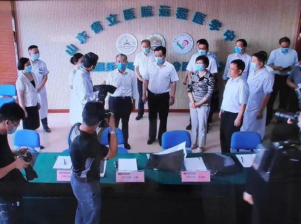 7月15日,山东省委书记刘家义率领山东省党政代表团来到新疆,视察了山东第一医科大学附属省立医院(山东省立医院)援建的新疆生产建设兵团医院远程医学中心,实时观看了我院呼吸与危重症医学科主任姜淑娟、影像科主任王锡明、心内科负责人苑海涛为新疆生产建设兵团医院一名心肺疾病患者进行的远程会诊。省卫健委党组书记、主任袭燕参加调研。山东第一医科大学常务副书记韩金祥、党(校)办主任董华、省立医院党委书记赵升田、院长赵家军及相关部门负责人参加视频连线。