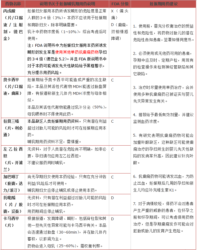 近日一篇名为“法国发现一药品副作用导致450个初生儿畸形”的报道在网上引起热议,其中涉及药物为广谱抗癫痫药丙戊酸钠(德巴金)。那么,抗癫痫药的致畸风险是否早已存在?各类抗癫痫药在说明书中对妊娠、哺乳期女性的使用又是如何规定的?我院临床药师根据药品说明书、FDA药物妊娠分级及药物药理特性对常用抗癫痫药物做出妊娠、哺乳期用药说明(附表),供大家参考。