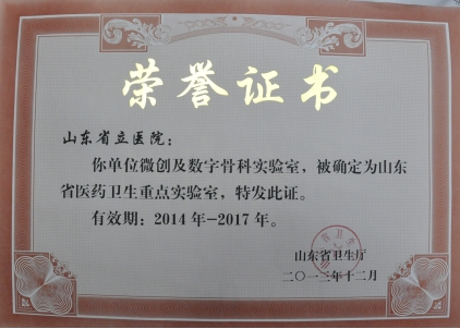 山东省骨科医院科研实力雄厚,具有雄厚的科研资金和良好的试验条件。现有骨科实验室1个,骨与关节康复技术中心1个,近来年获得各级科研项目20余项,科研经费500余万元,其中国家自然科学基金9项,山东省自然科学基金10余项。目前已出版专著20余部,在国内外核心期刊发表论文400余篇,其中中华系列期刊发表论文百余篇,SCI收录60余篇。近年来有20余项科研成果荣获国家级、省级科技进步奖。