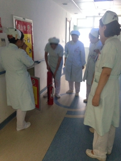 演练方案 报警组成员:值班护士刘惠娟,董岩,孙应娜 灭火组(灭火器组)成员:责任班A1-6,31夏晓静,杜吉莉,杨晓瑜。 灭火组(消防栓组)成员:责任班A7-22刘晓,赵静文,李叶。 疏散组成员:护士长,责任班A23-30乔克英,周莉莎,庞晓薇 场景1:白班发生火灾时,值班护士刘惠娟立即通知所有人员,杨晓瑜利用灭火器灭火,张金玲、董岩、孙应娜撤出易燃易爆物品,火势不能控制时,值班护士刘惠娟1.拨打内线“7110”向保卫部值班室报警,(要讲清起火科室,具体位置,燃烧位置),2.拨打“119”报出起火单位名称(山东省立医院经五纬七路山东上儿童医院二楼护士休息室微波炉起火),详细地址,火灾现场准确位置及起火部位,火势大小等。董岩通过最近手动火灾报警按钮或楼层电话向院内消防控制室报警。同时孙应娜关闭电闸,关闭氧气,防止火灾扩散。杨晓瑜取出就近手提式灭火器,迅速跑到起火部,去掉铅封,拔下保险销,一只手握住喷管,另一只手提着压把距火焰1——2米处,对准火焰根部,用力按下。张金玲取出水枪与水带一端连接,迅速跑到起火部,董岩将水带与供水阀门连接,迅速将水带伸开然后打开消火栓阀门开始救火。护士长、刘惠娟指挥现场人员迅速撤离,(危重患者由轮椅,担架或抱,抬走)提醒大家用湿毛巾,手帕等棉织物品捂住口鼻,同时告诉大家不要慌,不要挤,一个跟着一个考楼梯右走,维持好秩序撤离火灾区。 场景2.夜班发生火灾时,值班护士夏晓静首先拨打内线“7110:”报警,(要讲清起火科室,具体位置,燃烧位置),并报打“119” 报出起火单位名称,详细地址,火灾现场准确位置及起火部位,火势大小等,值班医生按下报警按钮,同时进行灭火,值班护士杜吉莉提醒大家用湿毛巾,手帕等棉织物品捂住口鼻,让大家不要慌,跟我来,一个跟着一个考楼梯右侧走,迅速的从安全出口撤离。