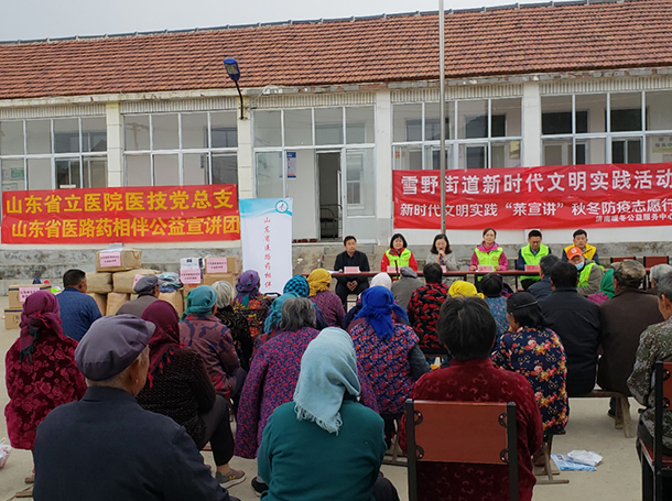10月31日,山东第一医科大学附属省立医院(山东省立医院)医技党总支、山东省医路药相伴公益宣讲团一行奔赴莱芜雪野镇李家庄村开展合理用药公益宣传活动。省立医院医技党总支书记曹云凤,医路药相伴公益宣讲团负责人、省立医院医技一支部书记、药学部副主任沈承武,药学部副主任赵雪梅参加活动。省立医院医技党总支医务人员代表、来自省立医院、千佛山医院、山东中医药大学附属医院、山东大学第二医院等多家医院药学部门的医路药相伴公益宣讲团成员等共计四十余人参加了活动。