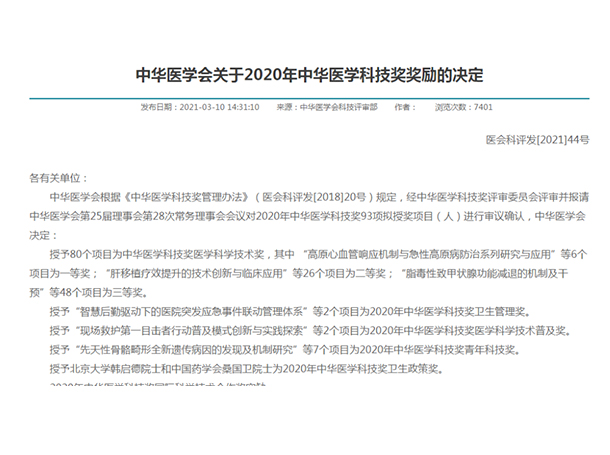 “中华医学科技奖”由中华医学会承办,经国家科技奖励工作办公室批准设立,是我国面向全国医药卫生行业的科学技术奖。旨在奖励在医学领域科学发现、技术发明和促进科学进步等方面作出突出贡献的个人和集体,其对提高中国医学科技创新能力和科技水平,推广和普及先进医学科学技术,激励科技人员攀登科技高峰起到了积极的作用。
