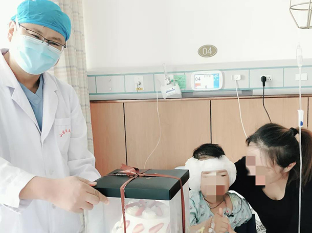 术中,医生发现手术当天也是孩子的生日,耳鼻喉科副主任于淑东当即委托团队医生为俊俊订蛋糕,庆祝俊俊的生日,也恭喜俊俊获得了新声。结束了当天手术后,于淑东还来到床旁看望俊俊,俊俊妈妈感动地热泪盈眶,回想这四年带着孩子走过的医路感慨万分,泪如雨下。