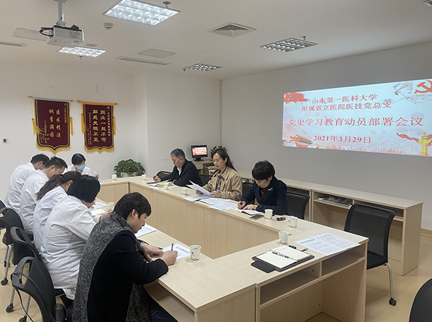 曹云凤带领各支部书记学习了《习近平总书记在党史学习教育动员大会上的重要讲话精神》、《中共中央<关于在全党开展党史学习教育的通知>的精神》、《山东省党史学习教育动员大会精神》、《山东第一医科大学党史学习教育动员大会精神》及《山东第一医科大学附属省立医院(山东省立医院)党史学习教育动员大会精神》。会上还进行了医技总支各科室医院新闻宣传优秀通讯员评选工作。