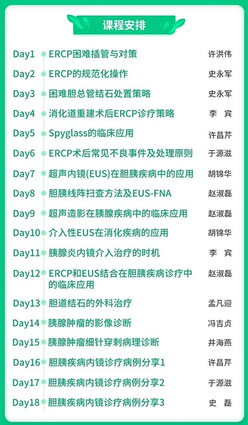 2021年,中国医学论坛报·壹生消化学院邀请山东第一医科大学附属省立医院(山东省立医院)消化内科许洪伟教授团队,共同策划推出《18天胆胰内镜训练营》,涵盖超声内镜、ERCP(内镜下逆行胰胆管造影)、Spyglass(经口胆道镜)等内容,从规范化操作至难点对策,涉及病理、影像、病例分享,每日视频讲课配套课后习题,18天提升胆胰系统疾病内镜诊治水平,训练营限时免费报名中!