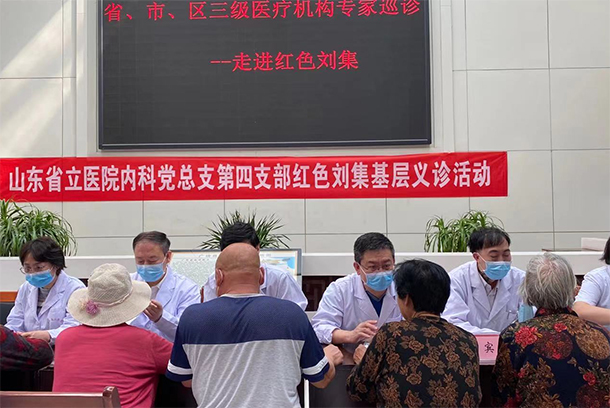 5月26日早上6点,第四支部的党员志愿者们乘车出发前往东营,与十二支部及东营市人民医院、河口区人民医院共计50余名党员专家走进了广饶刘集红色教育基地开展联合义诊。此次义诊共涵盖消化内科、重症医学科、乳腺甲状腺外科、血液内科、风湿免疫科、肛肠科、呼吸内科等多个科室,全面保障了广大居民对常见病的咨询诊治需求。