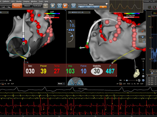 手术采用经典2C3L术式,血管内超声导管(ICE)指导下零射线穿房间隔后,快速精确建立左房三维模型,高功率完成肺静脉前庭隔离+房顶线、二尖瓣峡部线、三尖瓣峡部线消融,成功终止房颤、转复窦律;高功率消融使手术时间大大缩短,减少了患者术中痛苦,改善了患者术中配合。腔内超声显著降低了X线曝光量,避免了造影剂的使用,术中同时实时监测心包,可第一时间发现心包填塞等严重并发症,最大程度保证手术的安全性和有效性。