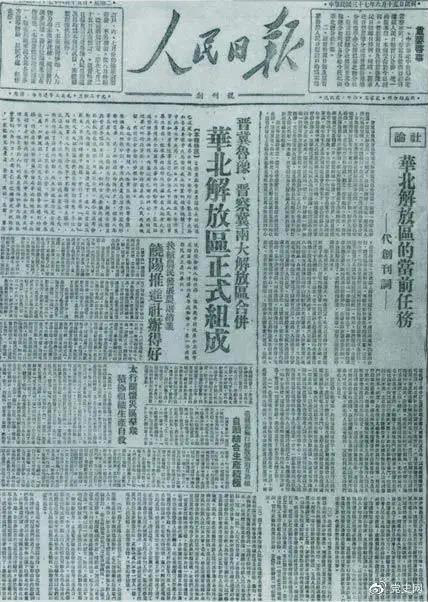 1948年6月15日,晋冀鲁豫解放区《人民日报》与《晋察冀日报》合并后出版的《人民日报》创刊号。