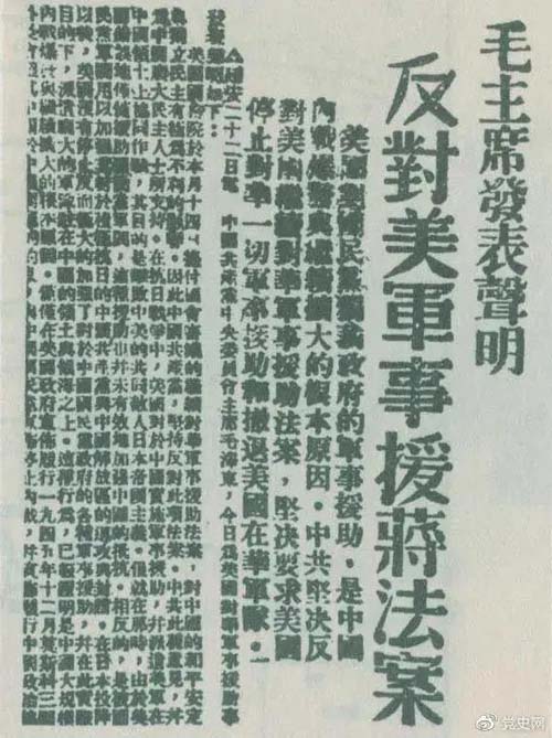 毛泽东以中共中央主席名义发表《反对美国对蒋军事援助法案的声明》。声明指出:美国国务院于本月十四日提付国会审议的继续对华军事援助法案,对中国的和平安定与独立民主有极为不利的影响,因此中国共产党坚决反对此项法案。中共此种意见,并为中国广大民主人士所支持。在抗日战争中,美国对于中国实施军事援助,并派遣美军在中国领土上协同作战,其目的是击败中美的共同敌人日本帝国主义,但就在那时,由于美国错误地仅仅援助国民党军阀,这种援助也并未有效地加强中国的抵抗,相反地是被国民党军阀用以加强其对于积极抗日的中国共产党与中国解放区的进攻与封锁。在日本投降以后,美国没有停止反而极大地加强了对于中国国民党政府的各种军事援助,并在此实际目的下派遣庞大的军队驻在中国的领土与领海之上,这种行动已经证明是中国大规模内战爆发与继续扩大的根本原因。美国实行所谓军事援助,实际上只是武装干涉中国内政,只是以强力支持国民党独裁政府继续陷中国于内战、分裂、混乱、恐怖和贫困,只是使中国不能实现整军复员和履行其对于联合国的义务,只是危害中国国家安全独立与领土主权完整,只是破坏中美两大民族的光荣友谊与中美贸易的发展前途。在此种现实情况之下,中国共产党不得不坚决反对美国政府继续以出售、交换、租借、赠送或让渡等方式将军火交给中国的国民党独裁政府,坚决反对美国派遣军事使团来华,并坚决要求美国立即停止与收回对华的一切所谓军事援助,和立即撤回在华的美国军队。