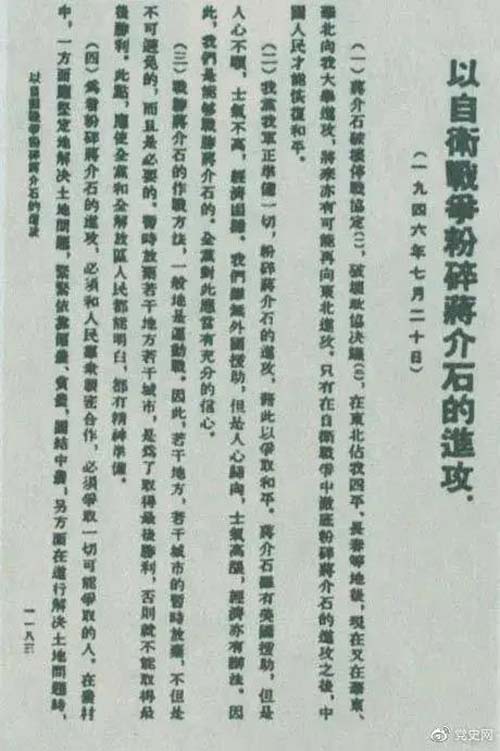 1946年7月20日,中共中央向全党发出《以自卫战争粉碎蒋介石的进攻》的指示,号召全党全军树立打败蒋介石的信心,并规定了战胜敌人的正确方针、原则和方法。图为当时的报道。