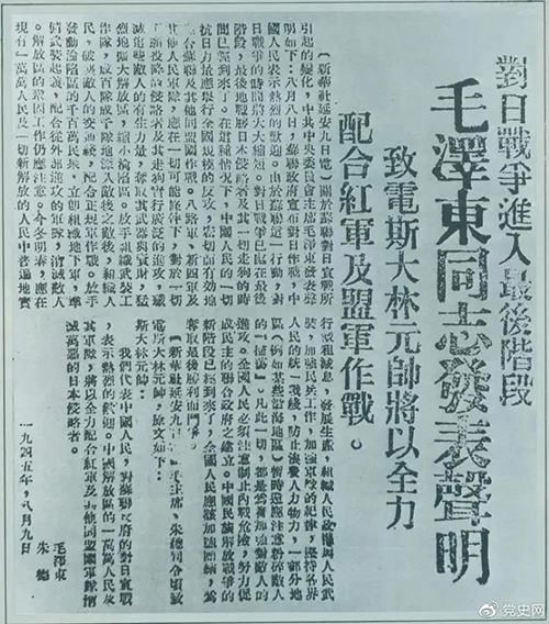 1945年8月10日,朱德发布命令,限令日伪军缴械投降。图为当时的报道。