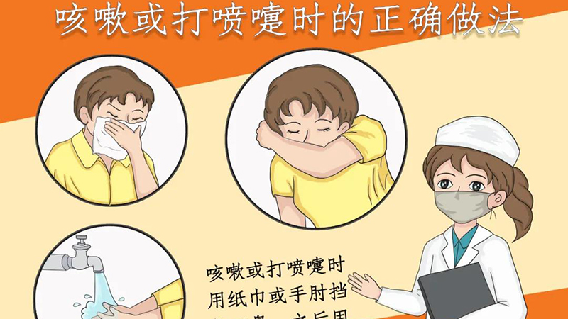 咳嗽打喷嚏时,用纸巾捂住口鼻,无纸巾时用手肘代替,注意纸巾不要乱丢。