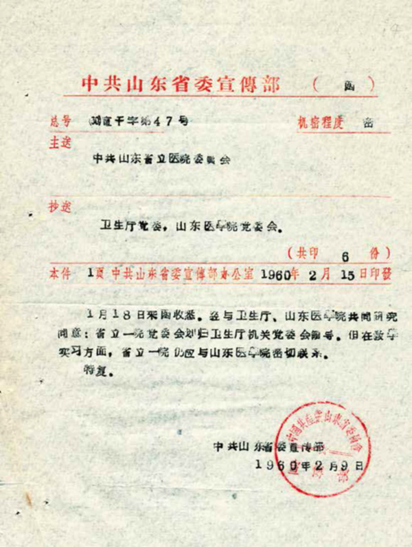 1960 年2 月9 日, 中共山东省委宣传部(60)宣干字第47 号函复:“经与卫生厅、山东医学院共同研究同意:省立医院党委会划归卫生厅机关党委领导。”
