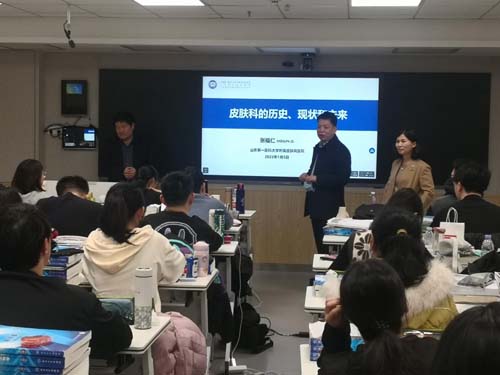 李乐平副院长主持活动。张福仁教授以“皮肤科的历史、现状和未来”为题,围绕皮肤性病学学科特点,详细介绍了该学科的历史、现状和未来发展趋势,并结合山东省皮肤病医院的发展历程,与同学们分享了临床医学人才培养模式和成果,为同学们带来了一堂生动有趣的理论授课。